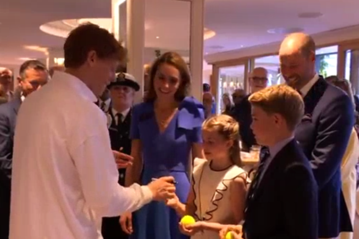Watch the moment Wimbledon champion Jannik Sinner gifted Princess Charlotte and Prince George a signed tennis ball after toppling Carlos Alcaraz.